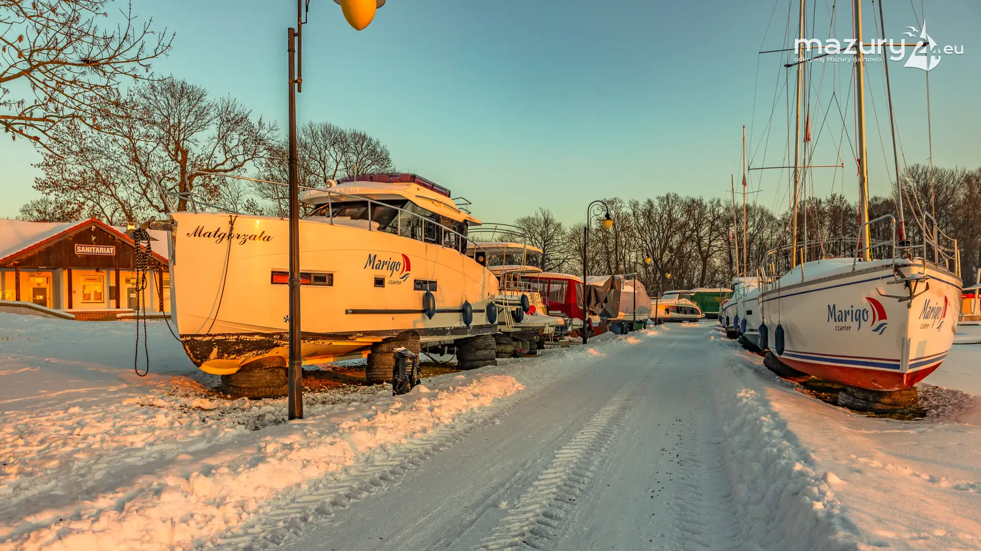 W największym porcie na Mazurach, na zachodach słońca jesteśmy minimum kilka razy w roku. Zimową wersję końca dnia mamy już za sobą. Port bez jachtów na wodzie wygląda troszkę smutno, z drugiej jednak strony, sezon w tym miejscu jest tak intensywny, że nie będziemy narzekać...