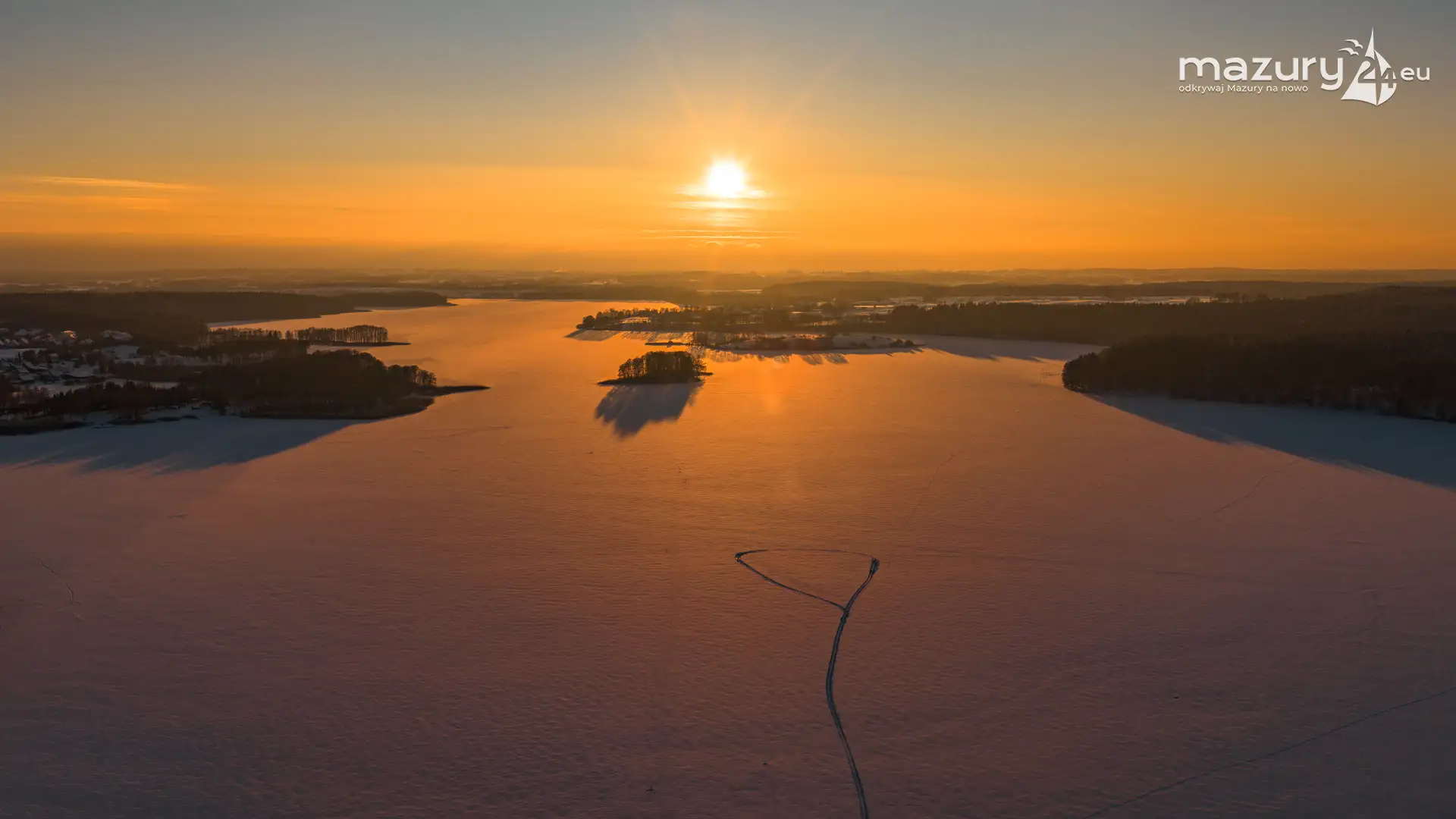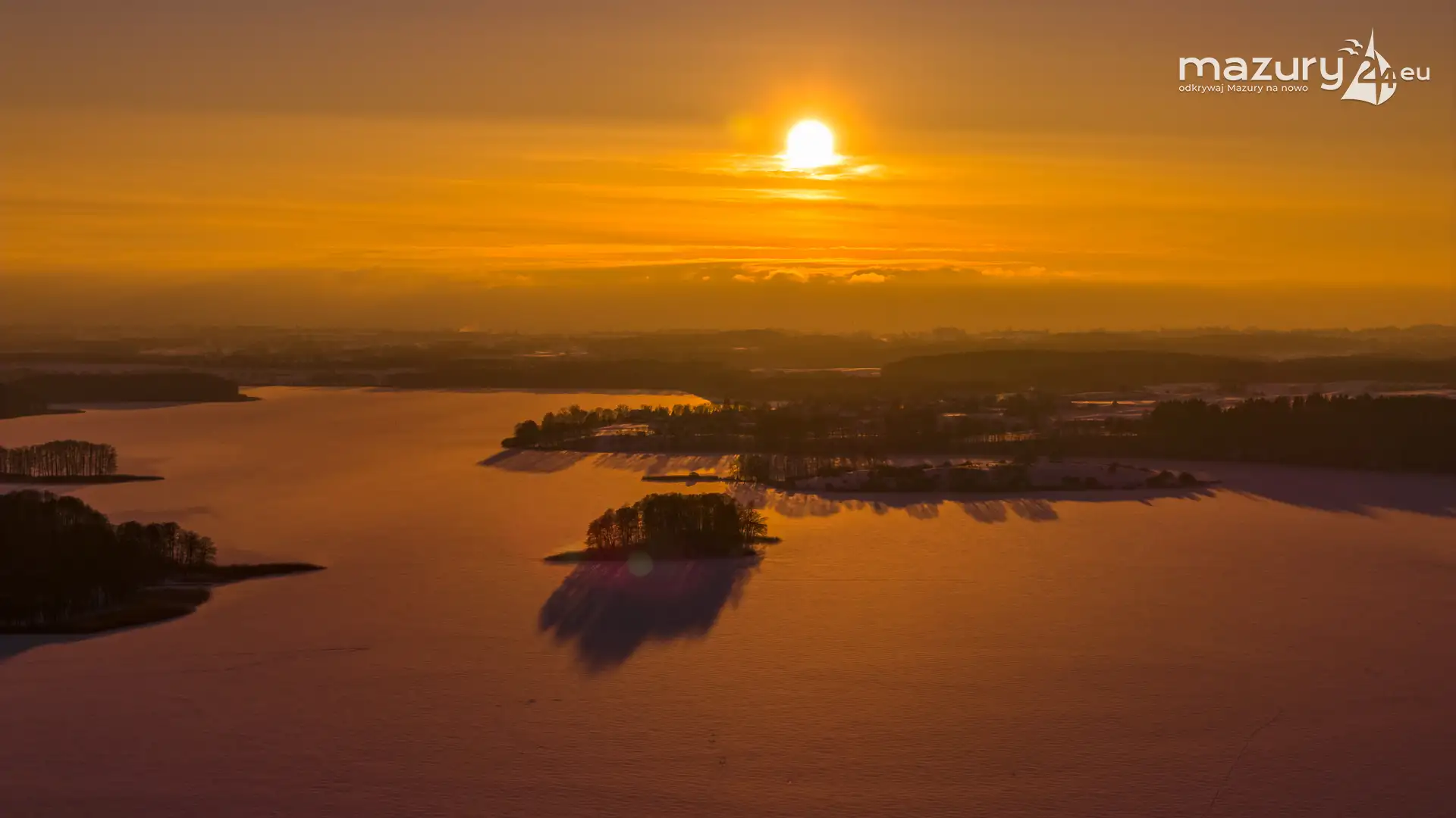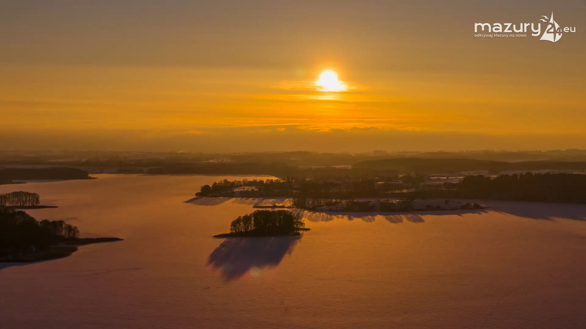 Zachód słońca nad jeziorem Ryńskim z drona, luty 2026 r.