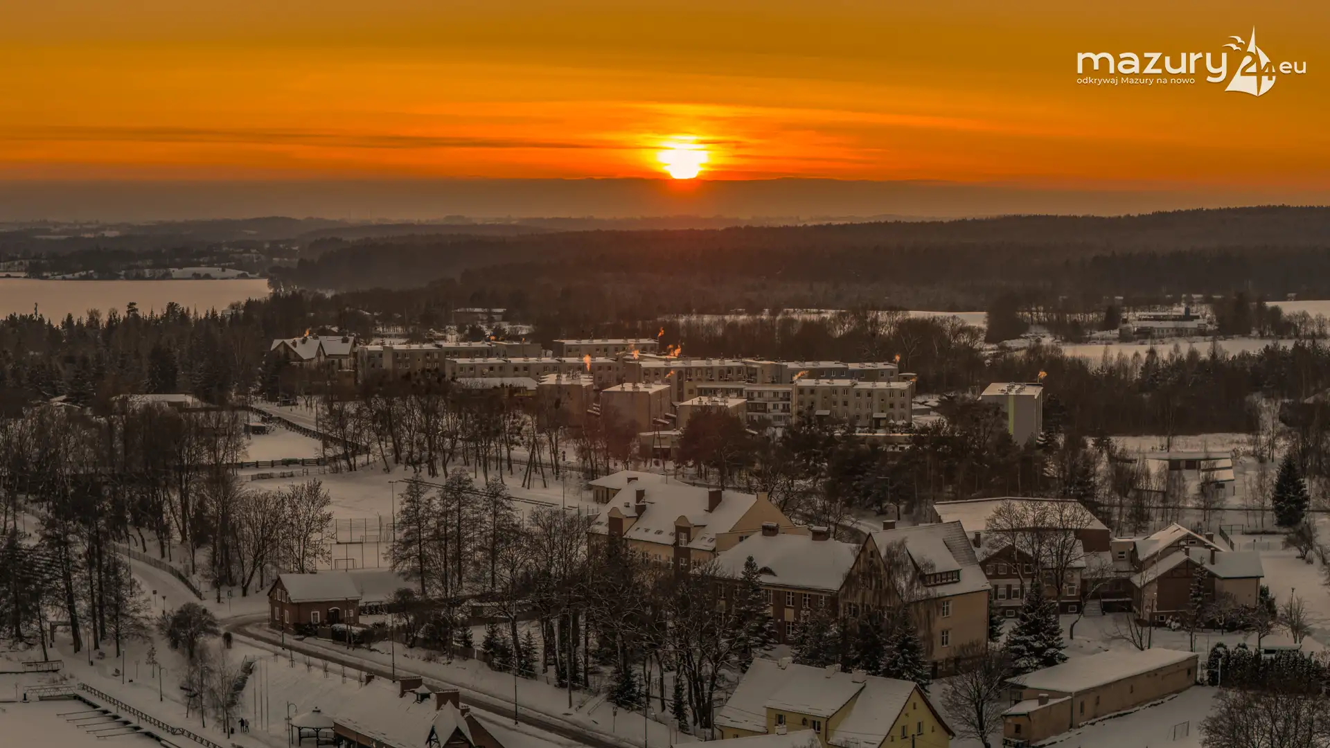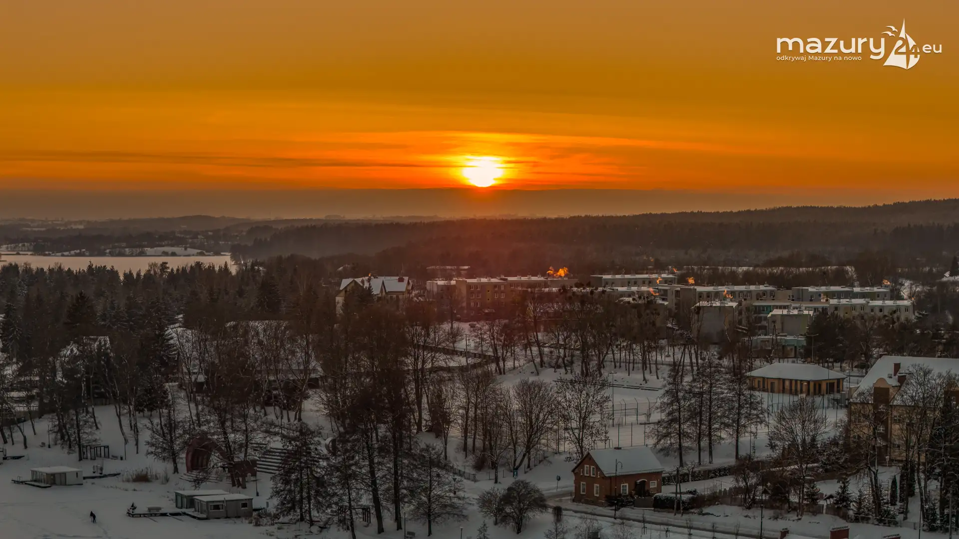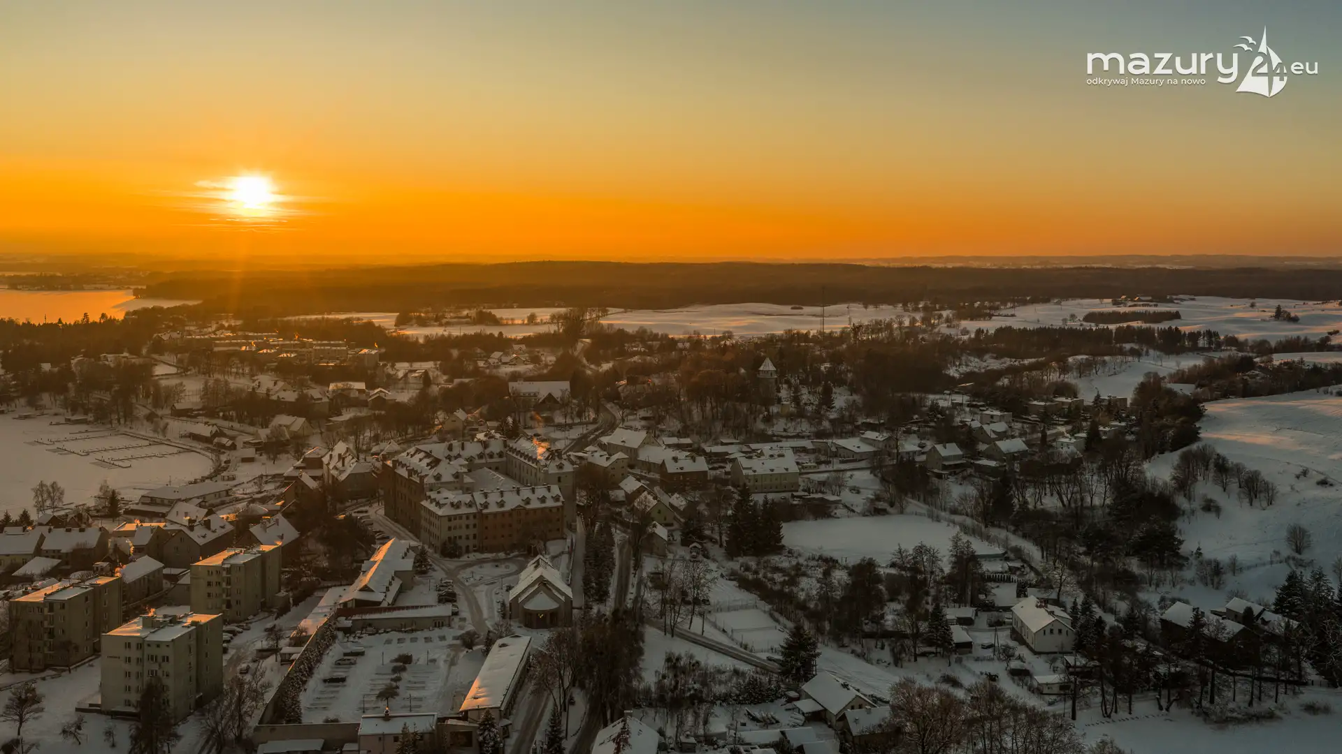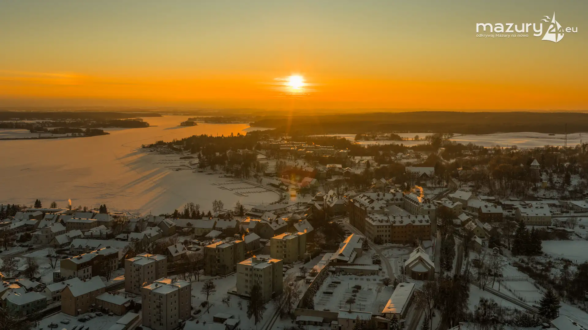 Zachód słońca nad jeziorem Ryńskim z drona, luty 2026 r.