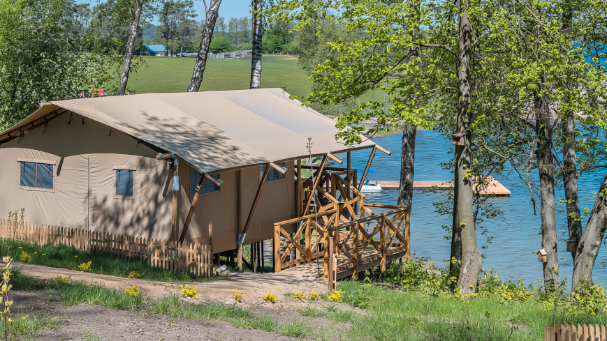 Goście zakwaterowani są w nowoczesnych, w pełni wyposażonych namiotach glampingowych, które łączą bliskość natury z wygodą apartamentu. Każdy namiot posiada prywatny taras z widokiem na jezioro, aneks kuchenny, komfortową część wypoczynkową, oddzielne sypialnie oraz nowoczesną łazienkę. Przemyślany układ wnętrz zapewnia wygodę zarówno parom, rodzinom z dziećmi, jak i mniejszym grupom.