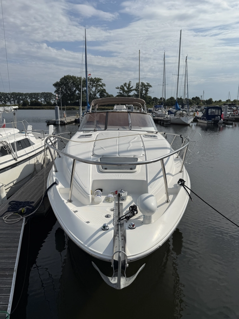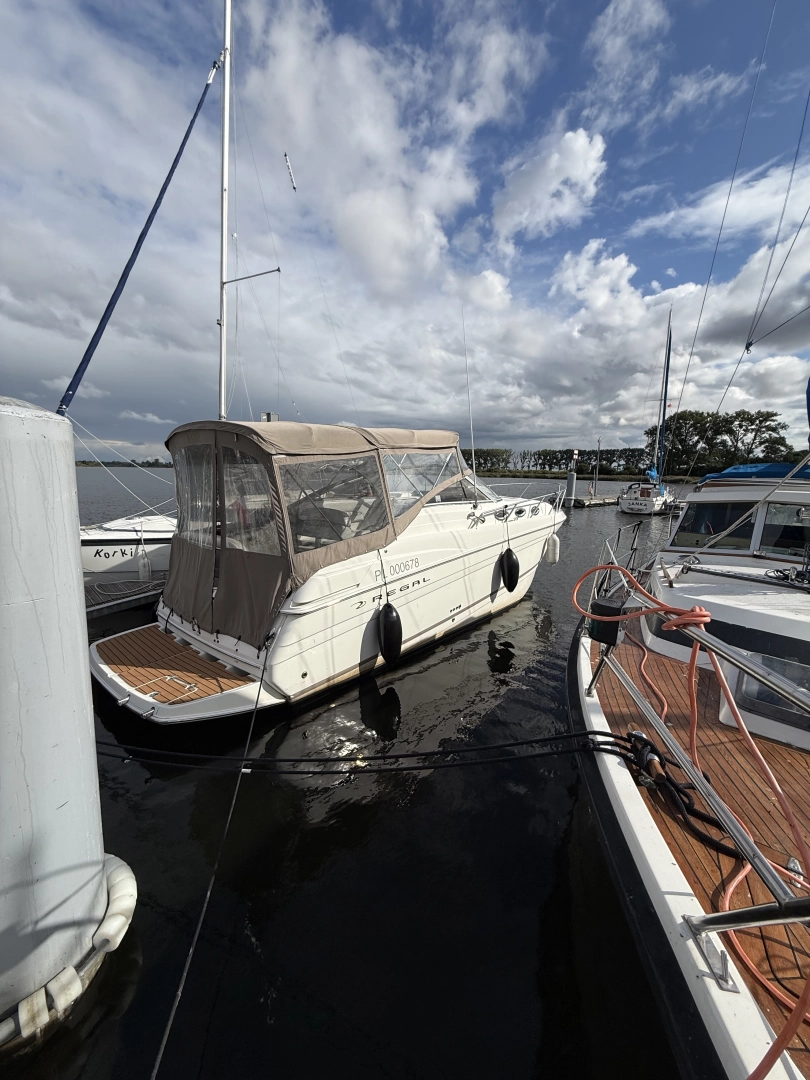 Dzień dobry sprzedam łódź motorową REGAL Commodore 2765 zbudowaną w 2003 r. Łódź sprowadzona do PL w 2006 r. i od tego czasu użytkowana tylko i wyłącznie przez 2 użytkowników . Przepływane zaledwie 450mtg Wymiary długość 9,10 m, - szerokość 2,59 m, wysokość 2,15m, - zanurzenie 90 cm. Zarejestrowana na 10 osób. Oddzielna sypialnia, dodatkowo rozkładany materac w mesie. Jacht serwisowany na bieżąco . Łódź jest w doskonałym stanie, pełen oryginał, nie wymaga żadnych nakładów. Napęd stanowią 2 silniki Volvo Penta 4,3 GL każdy. Oba silniki po pełnym serwisie, Wszystkie przeglądy - wymiana oleju w silnikach, przekładniach itd. robione przed każdym sezonem. Wszystkie zimy spędzone w hali. Łódź przed tym sezonem otrzymała: - malowanie dna łodzi antifoulingiem - akumulatory ER450 - nowe szyby w bimini - pełna polerka - nowy ster strumieniowy Lewmar - nowy, sterowany z konsoli, bardzo mocny szperacz LED - nowe radio Pioneer ze sterowaniem oraz b-th - silniki działają bez zarzutu wymienione dwie Zetki na Zetki z przebiegiem około 100 m/gDodatkowo w poprzednim sezonie wymieniono cały osprzęt lekki (odbijacze, kosze, cumy, gaśnice, bosaki, zestawy ratunkowe). Regal posiada bardzo wiele udogodnień, m.in: - płyta grzewcza – kuchenka - mikrofala - lodówka z zamrażarką - klimatyzacja z grzaniem - toaleta, macerator, prysznic w łazience oraz dodatkowy rufowy zewnętrzny, zlew zewnętrzny, - materac dziobowy do opalania - kotwica dziobowa automatyczna - oryginalna - moskitiery w bulajach - sterowane trym klapy - radio morskie - kompletne duże bimini + plandeka transportowa - głębokościomierz Łódź do obejrzenia do 15.10.25 na wodzie, po tym terminie będzie zimowana w hali w Błotnik koło Świbna . Cena 185.000 PLN Dla zdecydowanego Klienta dedykowana przyczepa w cenie. Po więcej informacji zapraszam na priv, tel. 788748120
