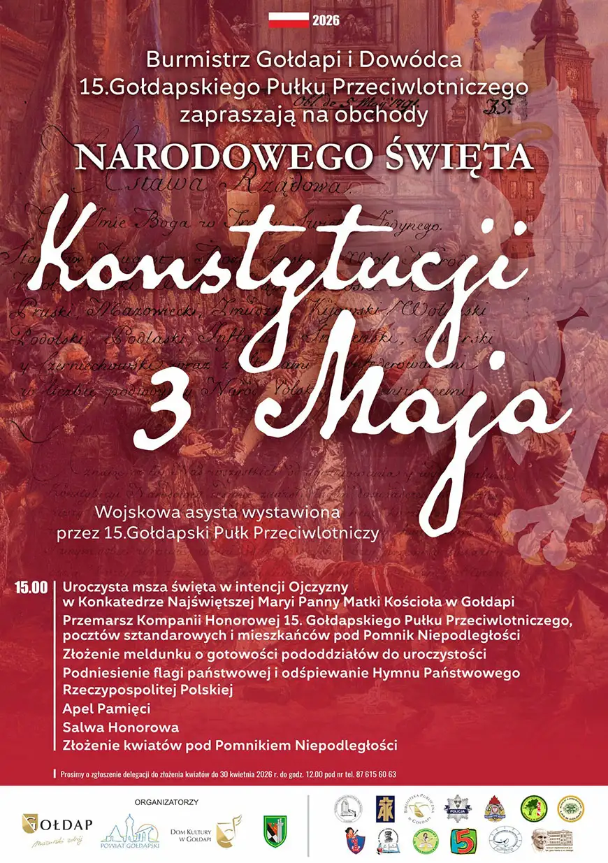 Burmistrz Gołdapi Konrad Kazaniecki oraz Dowódca 15. Gołdapskiego Pułku Przeciwlotniczego zapraszają mieszkańców do udziału w uroczystościach z okazji Narodowego Święta Konstytucji 3 Maja.