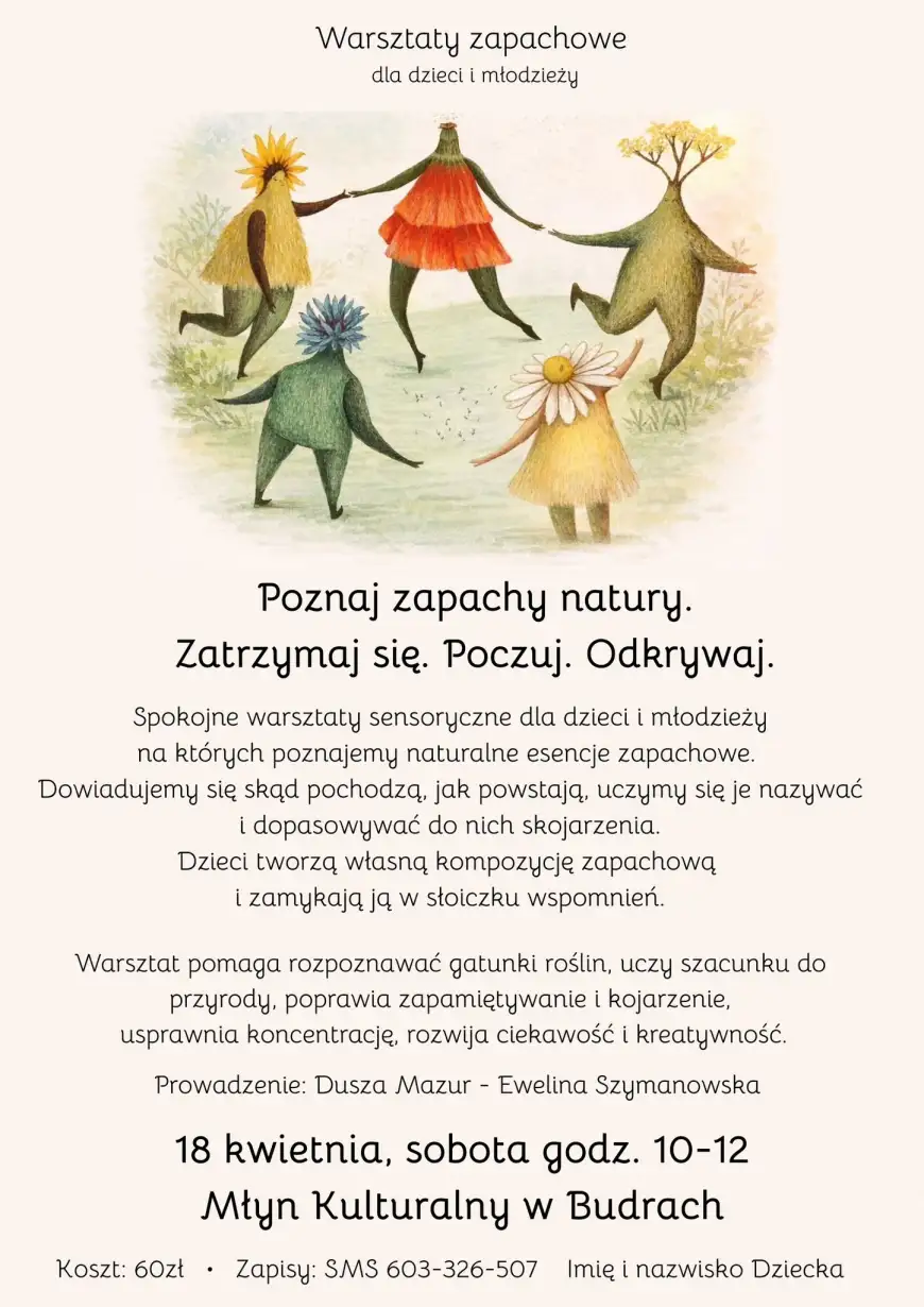 Serdecznie zapraszamy już 18 kwietnia o godzinie 10:00 na wyjątkowy warsztat z mazurską senselierką i aromaterapeutą, specjalizującym się w multisensorycznej pracy z zapachem. Spotkanie odbędzie się w Młynie Kulturalnym w Budrach (powiat Węgorzewo).
