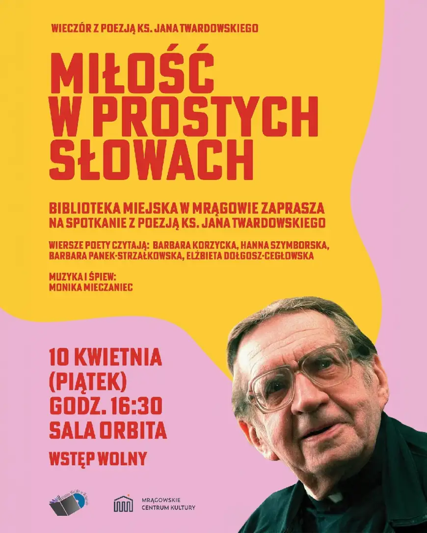 Biblioteka Miejska w Mrągowie zaprasza na wyjątkowy wieczór poetycki poświęcony twórczości ks. Jana Twardowskiego (1915–2006) – duszpasterza, poety i prozaika, którego utwory od lat zachwycają prostotą i pełnym ciepła spojrzeniem na świat oraz drugiego człowieka.
